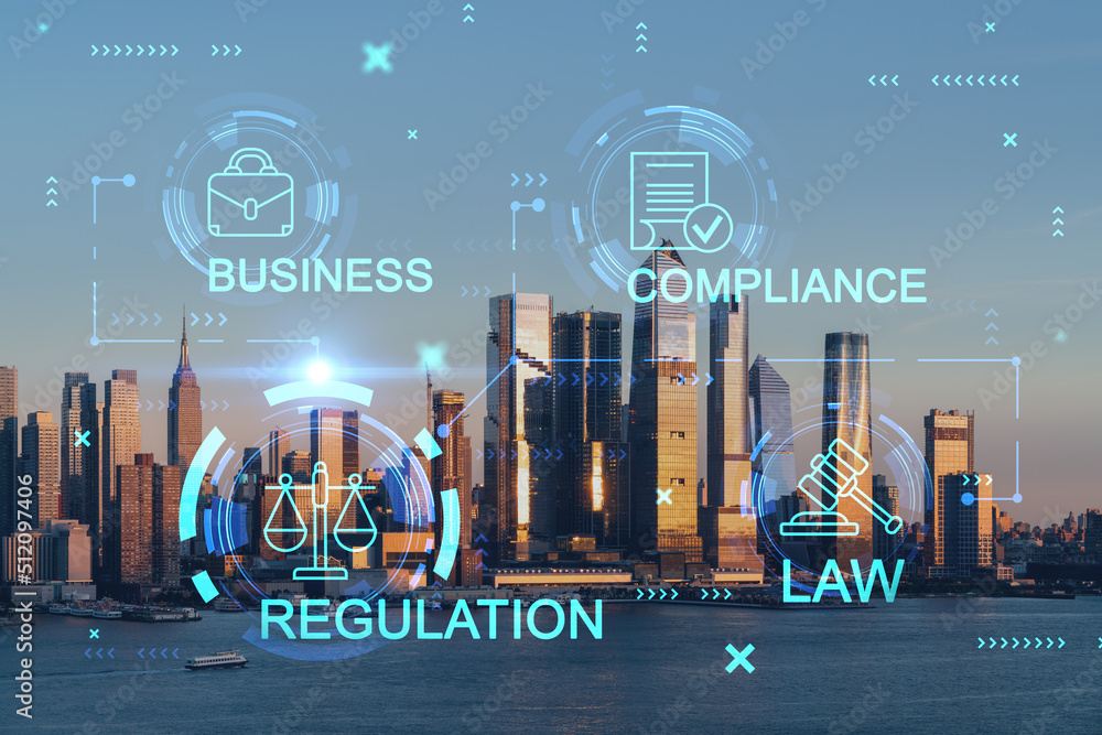 New York City skyline from New Jersey over Hudson River with Hudson Yards skyscrapers at sunset. Manhattan, Midtown. Hologram legal icons. The concept of law, order, regulations, digital justice