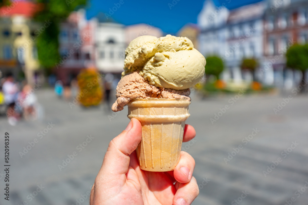 Pistachio and coffee ice cream in a cone on the market square in Puck. Poland