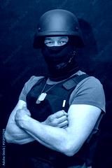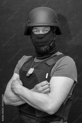 muscular military 45-50 years old in a bulletproof vest and balaclava, army helmet on his head, black background. Concept: volunteer at war, war in Ukraine, civil self-defense, army unit.