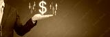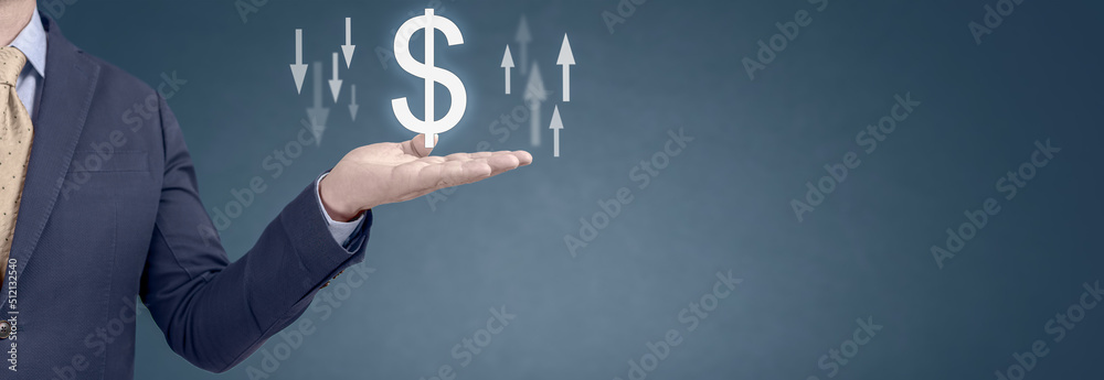Business person showing arrow and dollar sign. Businessman holds dollar sign with arrow symbolizing that dollar rates are going down or up. blue background. wide banner
