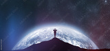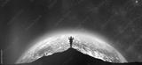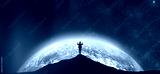 Silhouette Businessman Standing Against Illuminated Globe At Night. Business Opportunity Concept. Male against planet Earth. Digital Composite Image