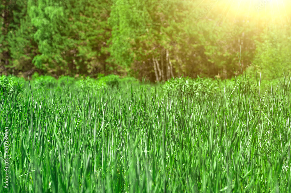 Summer landscape. Fresh green spring grass with sun leaks effect, copy space. Soft Focus. Abstract nature background. Banner.
