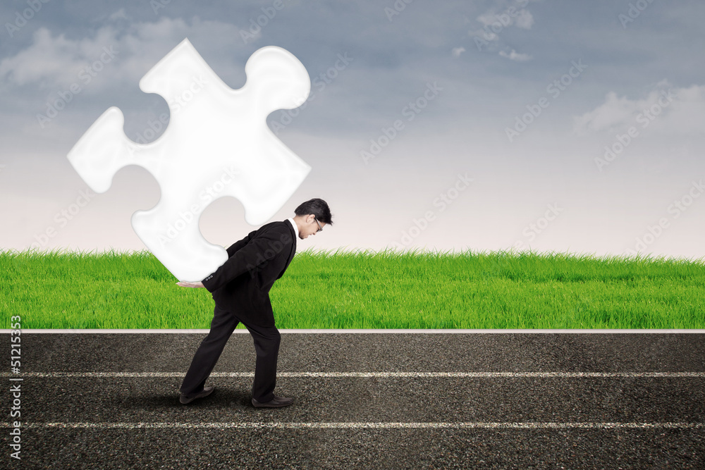 Asian businessman carry puzzle on the road