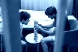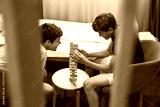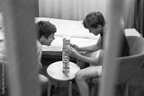 Unstable wooden structure near collapse. Two friends play a game together at home