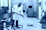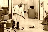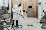 Middle age male working in industrial slaughterhouse and finishing his daily job. He is cleaning and washing food processing plant floor and machinery production lines with water.