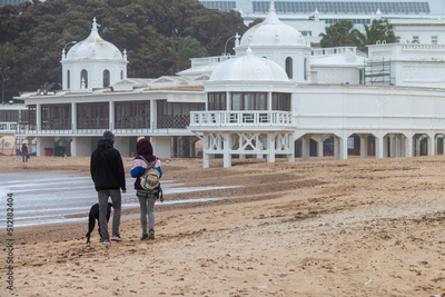 Nice landscape with a couple walking with their dog on the Caleta beach, in Cadiz, Andalusia, Spain