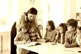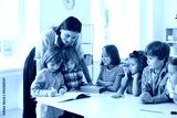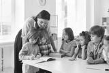 Young school teacher helping her happy elementary students who are writing in notebooks. Little children learning new things in class. Group of talented kids watching their classmate draw a picture