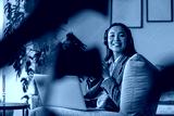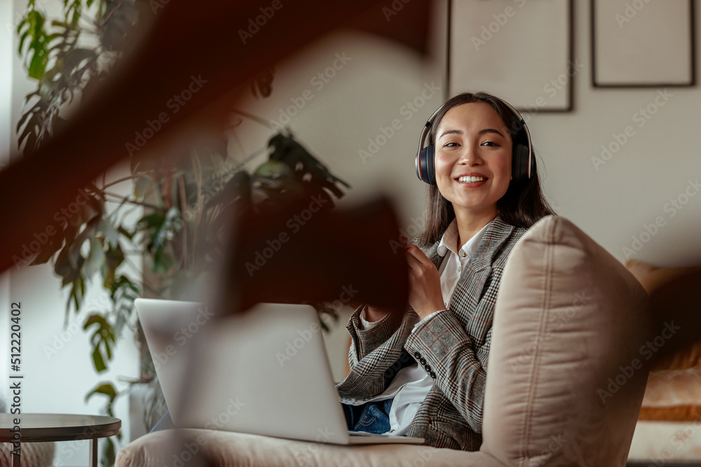 Attractive asian business woman listening music sitting with laptop in office and looking camera