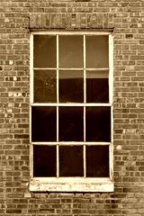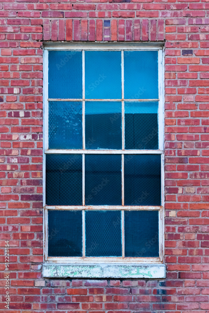 Close up of old window with white grilles and stone sill on old brick building, vintage aged building