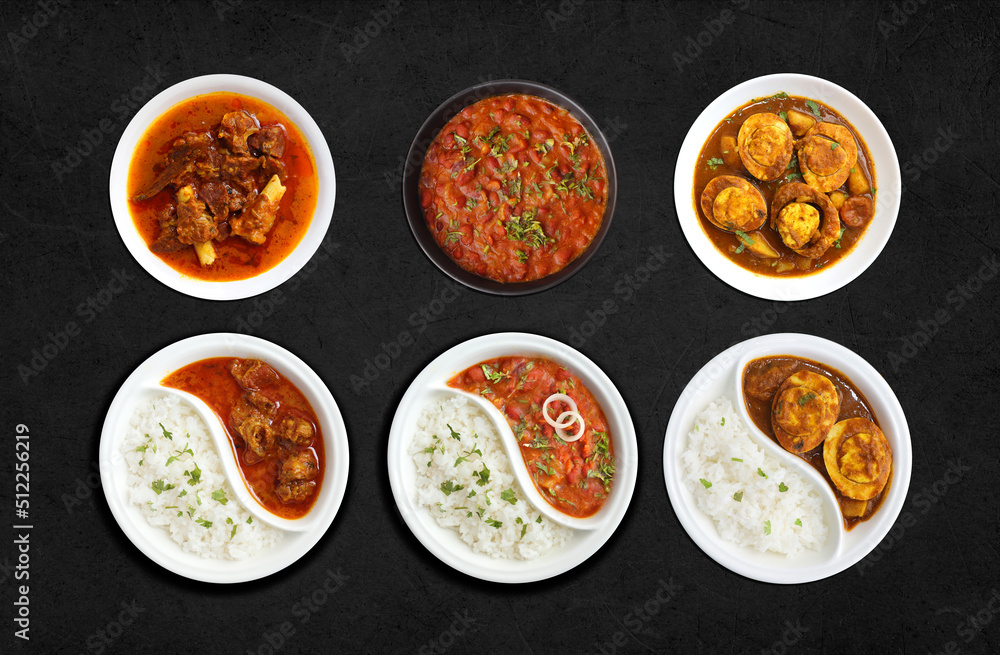 Assorted Indian Rice and curry dishes in one banner. Dal rice, Egg curry, Rajma chawal and mutton curry. Dark moody food banner for website or restaurant menu. Copy space.
