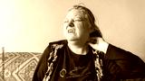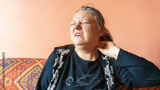 Old woman suffering from neck hernia pain. Unhappy woman holding her neck, sitting on sofa at home or house, feel sick. Empty or blank copy space (area) for texts.