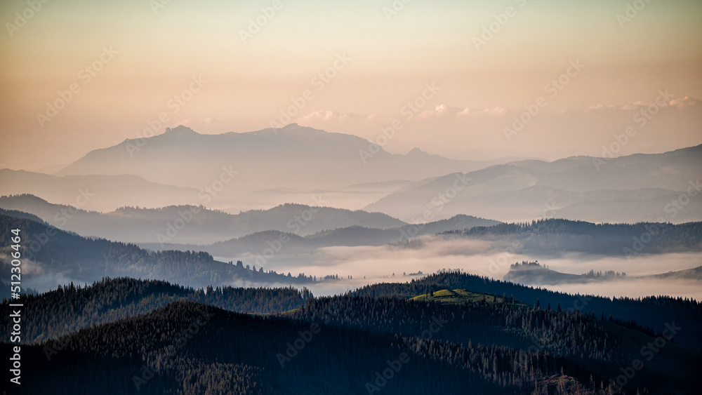 The Ceahlau Massif seen from the Rarau Mountains, Eastern Carpathians, Romania.