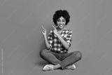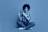 Full length portrait of cheerful pretty person indicate fingers empty space offer isolated on orange color background