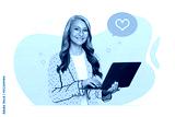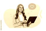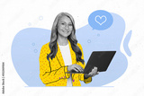 Composite collage image of aged lady smile hands hold use wireless netbook receive like notification comment