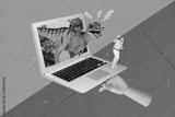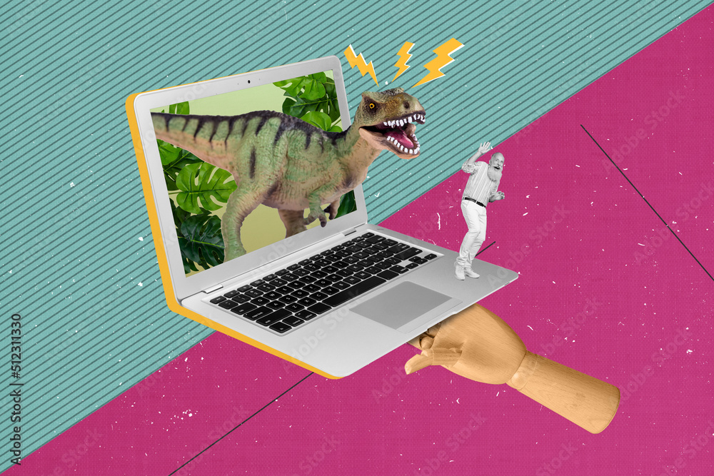 Zine artwork collage of small senior man stand netbook frightened alive dino attack him isolated bright color background