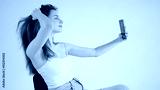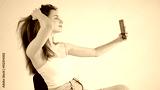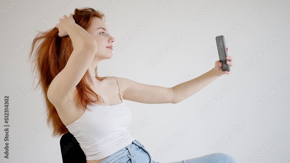 Beautiful young woman touching her hair and takes a selfie photo on the phone.