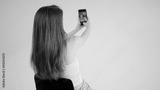 Beautiful young woman takes a selfie photo on the phone. View from the back