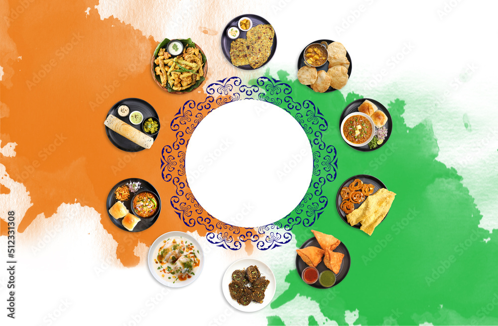 Indian food Banner over flag color Background.The concept for Indian happy Independence or Republic day food. copy space. Snacks include Medu vada, Paratha, Samosa, Jalebi, Pav Bhaji, Dosa, and Pakoda