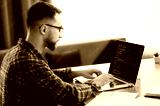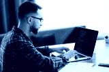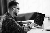 Developing coding technologies, IT concept. Side view at male IT-specialist uses laptop with programming code on the screen. Smart male programmer working at home with coding technology, writing codes