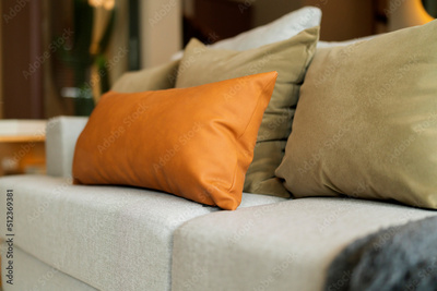 contemporary interior of Living room with part of sofa and arrange set of decorate pillow in sunny day and white curtain interior detail design background concept