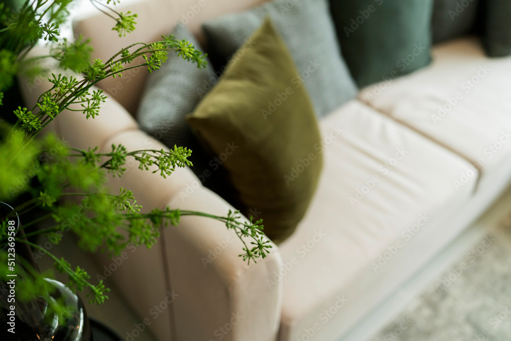 contemporary interior of Living room with part of sofa and arrange set of decorate pillow in sunny day and white curtain interior detail design background concept