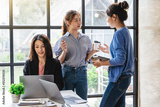 Asian creative team sitting and working sharing creative ideas inspire in workshop together.