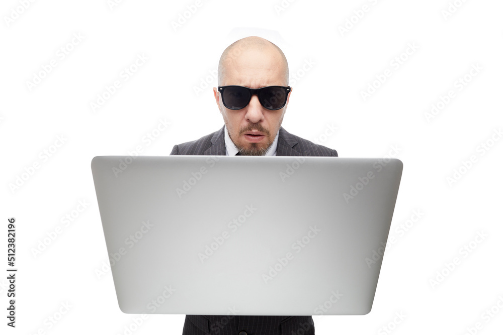 A funny bald man in suit and in black sunglasses looking strange at his is laptop isolated on white background. Conspirator concept.