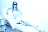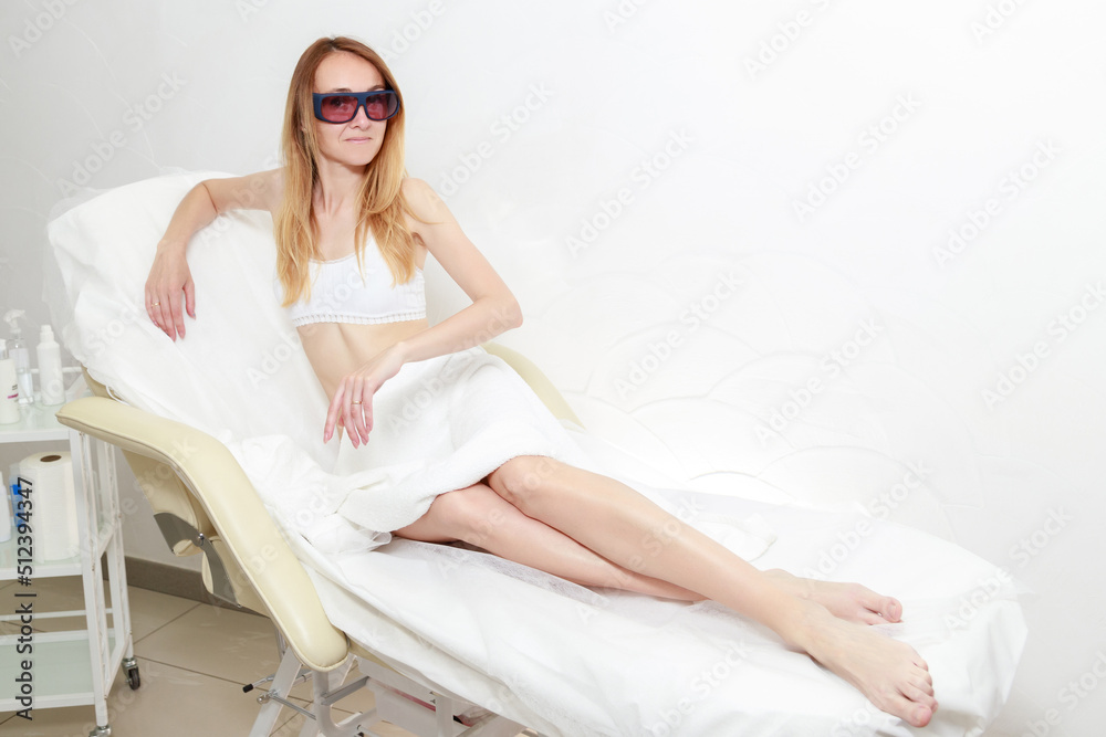 attractive woman on the armchair at the beautician. laser epilation procedure