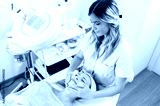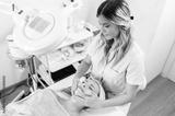 Beautician therapist applying face treatment in beauty salon to young woman.