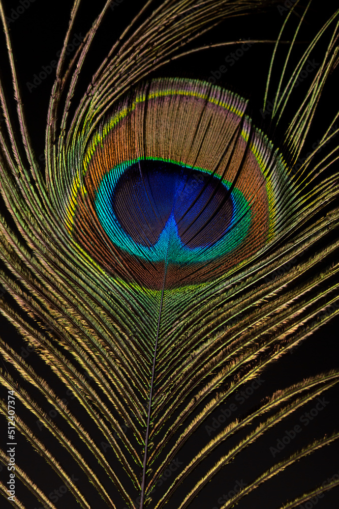 Colorful shiny peacock feather on black.