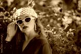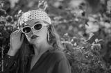 Fashionable confident woman wearing retro style sunglasses, polka dot print bandana, pearl hoop earrings, posing in red rose garden. Summer fashion conception. Copy, empty space for text