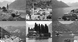 Collage of travel. Perast. Montenegro. Panoramic view of the city and bay on the sunny day.