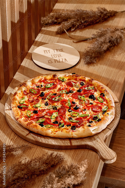 Original neapolitan pizza margherita on a traditional wooden plate , Italy. Pizza with olives.Wooden background, top view