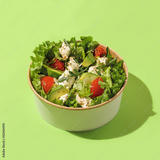 Fresh vegetable salad with tomatoes, cucumbers, mix lettuce leaves. Green summer salad with feta and cherry tomato. Healthy food. Isolated. green background