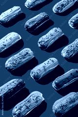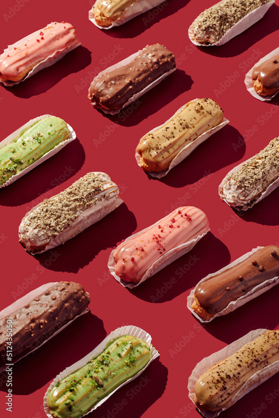 Sweet food pattern of eclairs with color topping. Sweet shacks, minimalism
