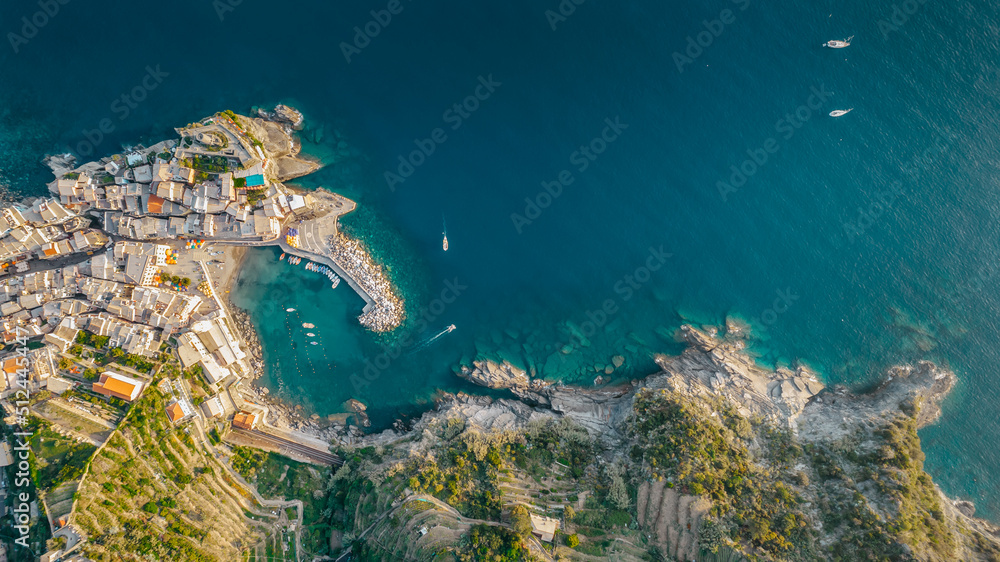 Aerial view of Vernazza and coastline of Cinque Terre,Italy.UNESCO Heritage Site.Picturesque colorful coastal village located on hills.Summer holiday,travel background.Italian Riviera with beaches