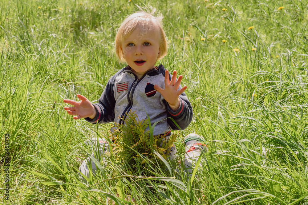Cute adorable little caucasian kid toddler boy having fun sitting on green grass lawn at home yard garden.Child on lawn walking in backyard. Happy childhood, children's healthcare, serenity concept