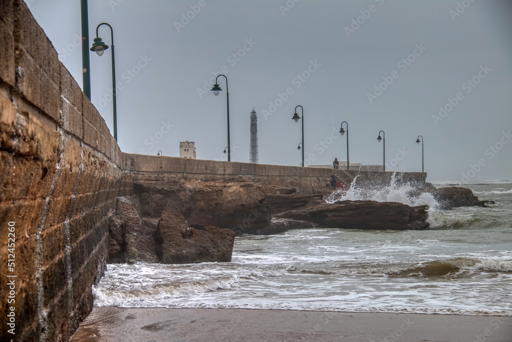 Waves breaking against the rocks on the beach of Caleta de Cadiz on a stormy day