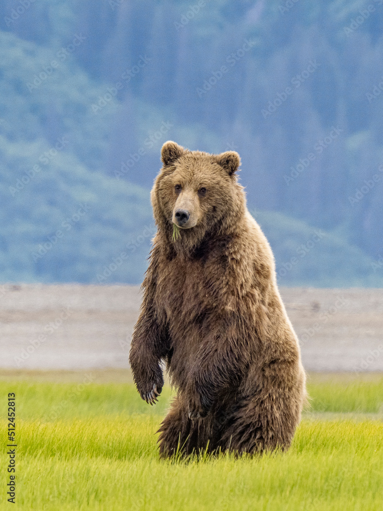 Coastal brown bear standing and looking at you in Chinitna bay, Alaska