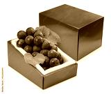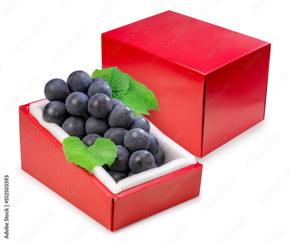 Bunch of black grape n red gift box isolated on background, Kyoho Grape with leaves isolated on white With clipping path.
