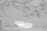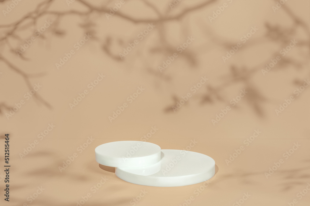 Abstract minimal nature scene - empty stage and circle podium on beige background and soft shadows of rose flowers and leaves. Pedestal for cosmetic product and packaging mockups display presentation