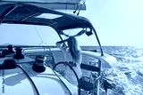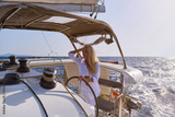 beautiful woman standing on yacht captain's bridge at sunny summer day