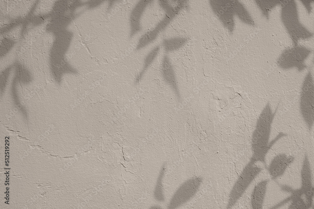 Abstract tree leaves shadows on beige concrete wall texture with roughness and irregularities. Abstract trendy colored nature concept background. Copy space for text overlay, poster mockup flat lay