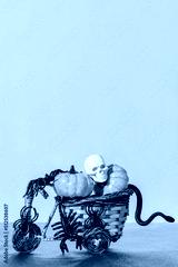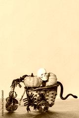 Vertical composition of pumpkins, spiders and snakes with a human skull.