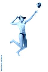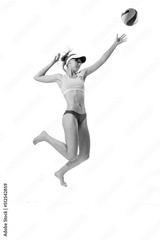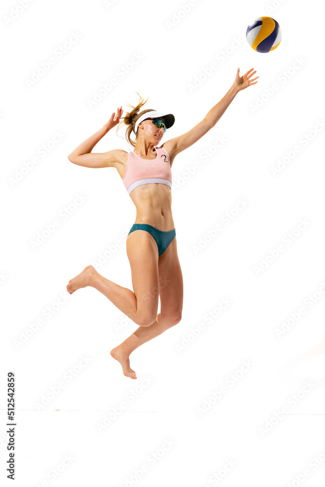 Studio shot of one fitness young woman, volleyball player in sports swimsuit playing bach volleyball isolated on white background. Sport, healthy lifestyle, team, summer