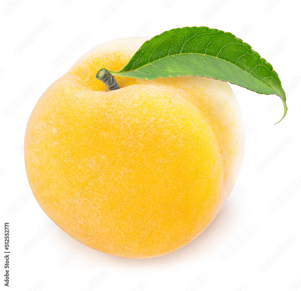 Sweet Yellow Peach fruit with leaf isolated on white background, Fresh Peach on White Background With clipping path.