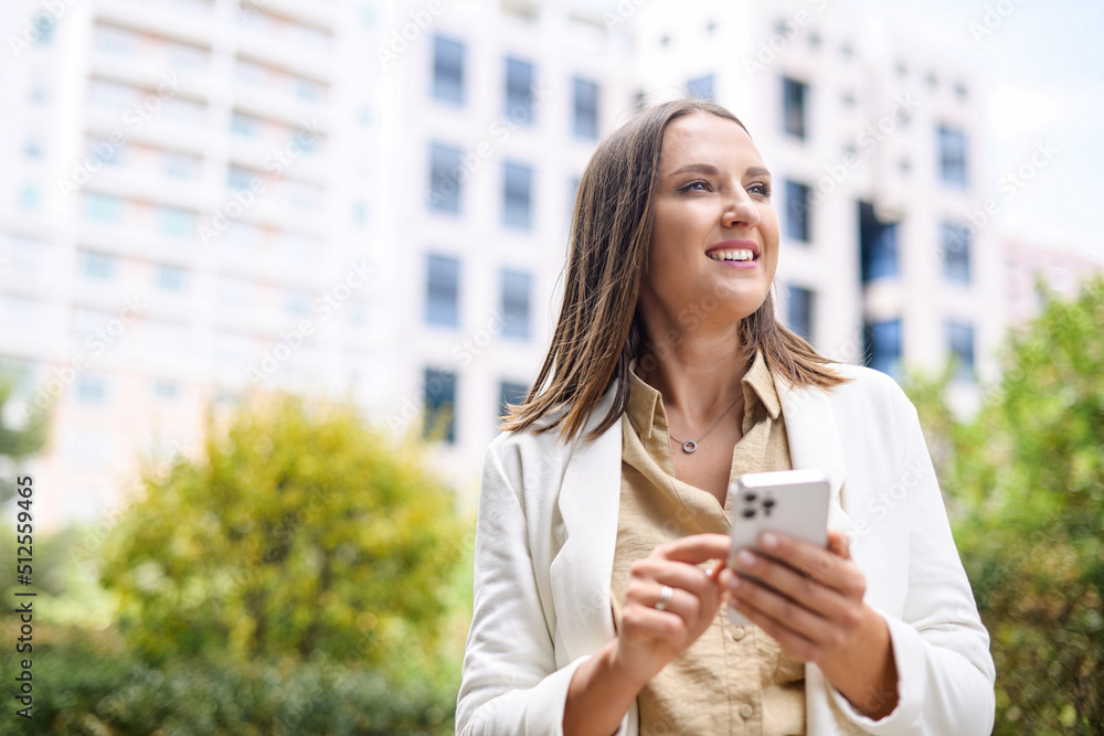 Business and technology concept. Smiling charming female office employee using smartphone outdoors, young businesswoman with mobile phone on the city street