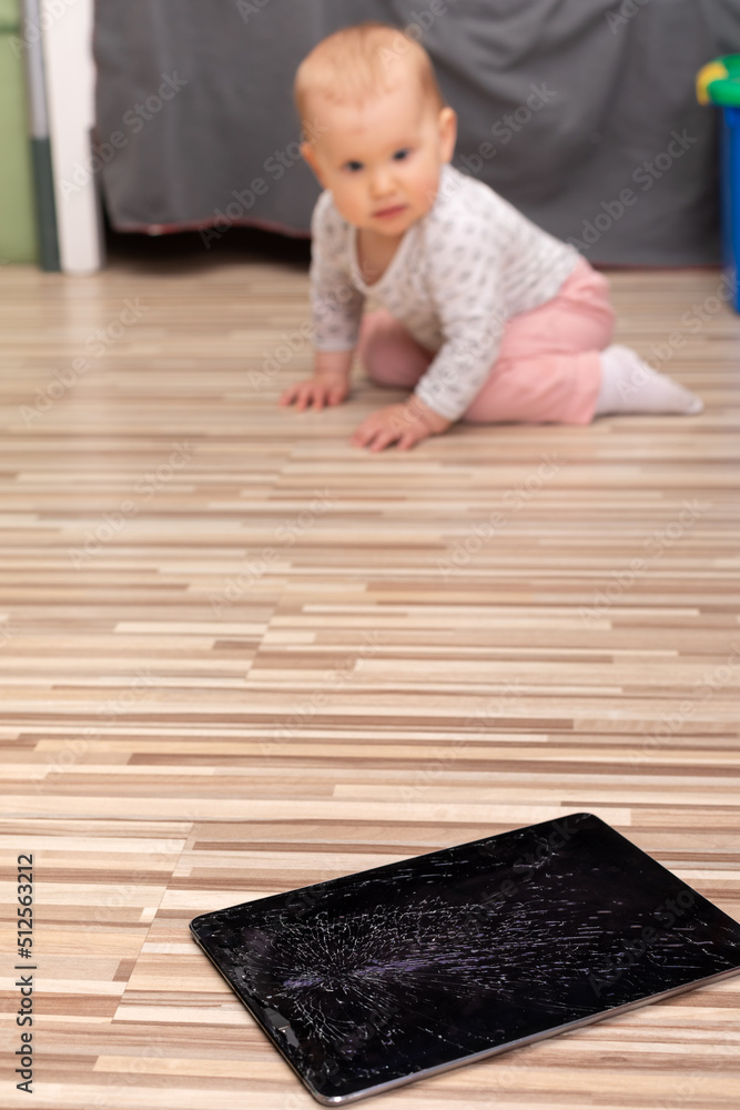 Broken tablet computer lying on a floor with cracked touch screen. Little baby who broke it is in background