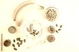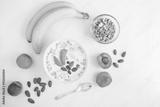 Granola breakfast with milk, fruits and almonds in the white bowl on the white tablecloth. Top view. Closeup.