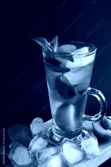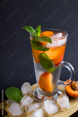 Infused water with apricot and mint in the drinking glass on the dark background. Closeup. Location vertical.